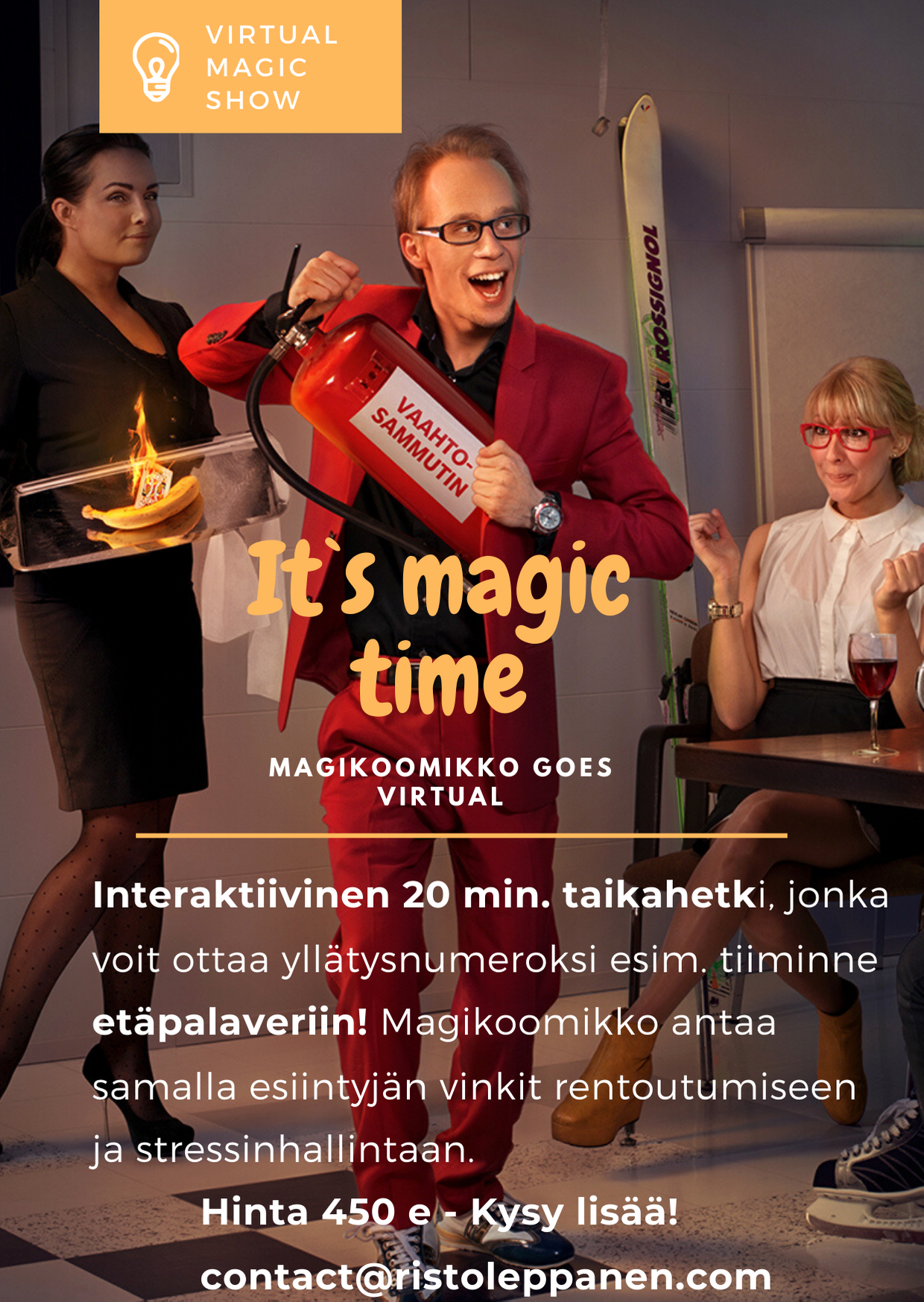 Kansainvälisen tason taikuutta ja huumoria yritystilaisuuksiin ympäri Suomea. Risto Leppänen on useasti palkittu magikoomikko - taikuri ja koomikko samassa persoonassa. Hänen vauhdikas esityksensä tarjoaa mukaansatempaavan annoksen hyvällä maulla toteutettua tilannekomiikkaa, ällistyttävää taikuutta ja mieltä kutkuttavaa mentalismia. Tuotteenne tai palvelunne voidaan myös nostaa taikuuden avulla mieleenpainuvasti esille. Kun kaikki tämä tehdään yli 20 vuoden kokemuksella ja täydellä tyytyväisyystakuulla, voit järjestäjänä itsekin rentoutua ja nauttia show`sta.